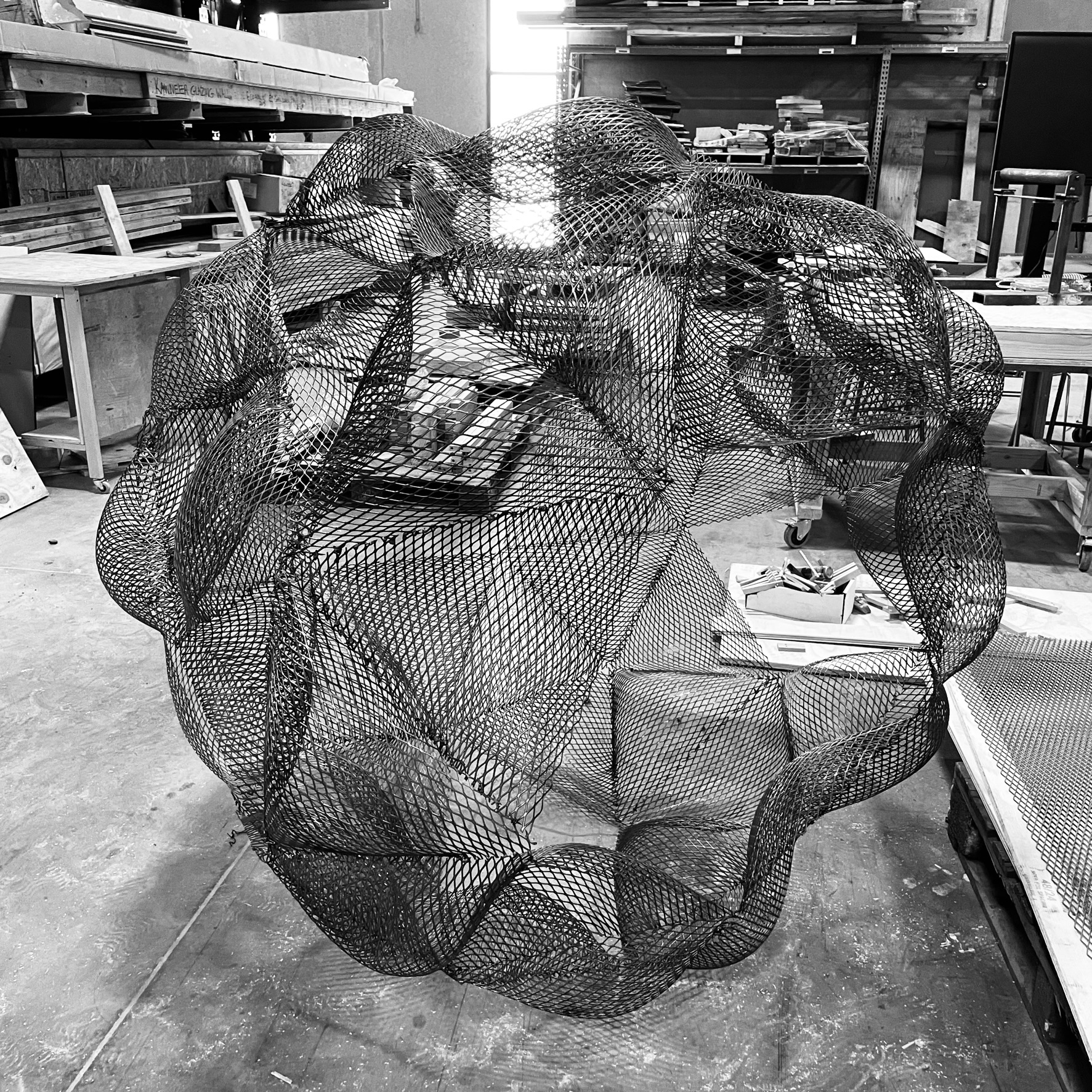 Design and Build Studio has been the core of architectural education at the University of Kansas, which is a very practical process, that is, students proposed designs and built them. Several fronts of Design Build Studios are given at the KU, some focuses on architecure procatice such as Studio804, some focuses sustainability such as Solor Decathlon Group, some focus on mobile architecture and some focus on environmental design. This studio is focusing on digital fabrication where students are given a task to utilize the materials recycled from the School of Architecture and Design at the KU to fabricate high-degree NURB surfaces. The recycled materials are various, including drafting desktops, table legs, roofing metal meshes and so forth. The major mission for students is to design a fabircation system which can be applied to any NURB surface, and most important of all, they have to incorporate the recycled materials. In the end, five teams delivered the five projects, shown as below.