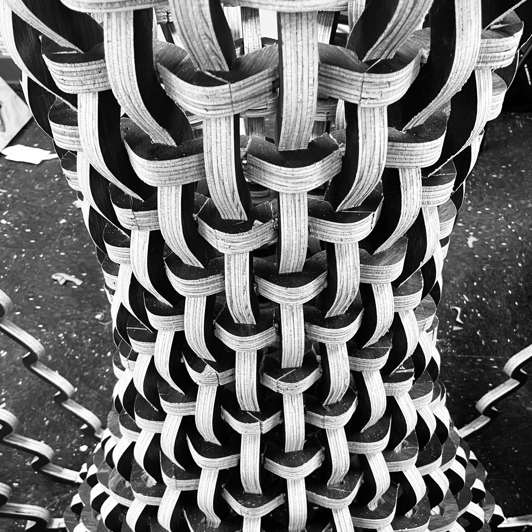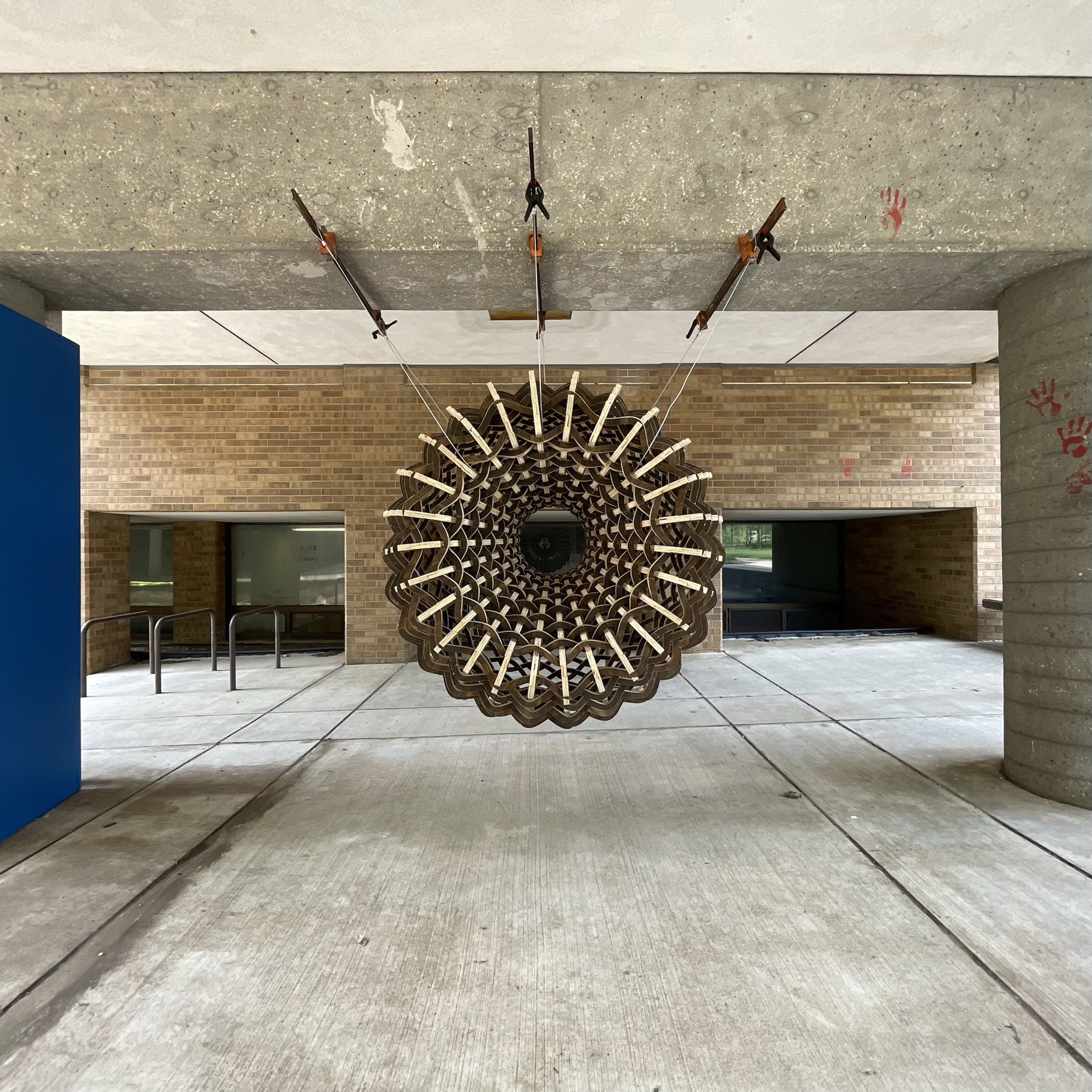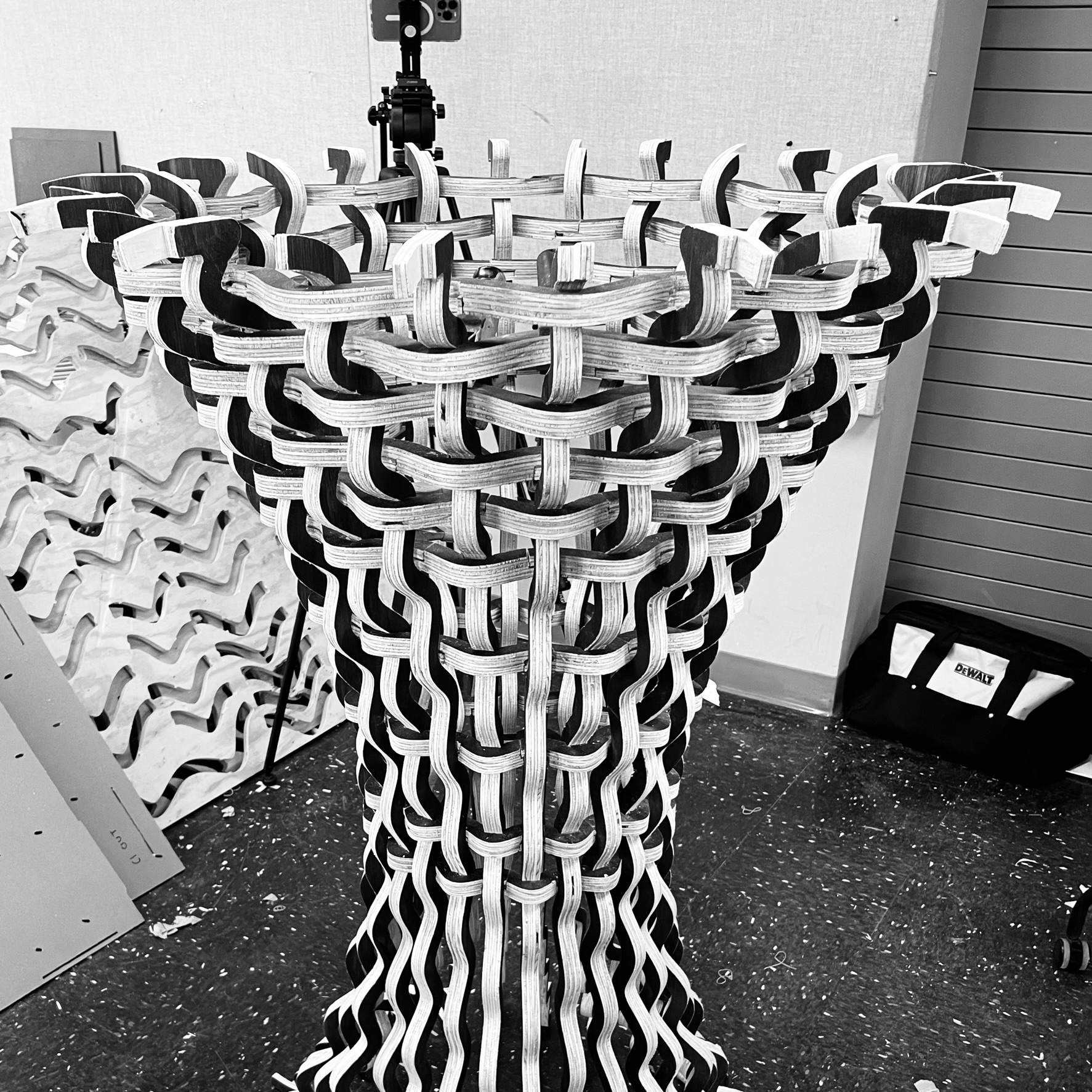 Design and Build Studio has been the core of architectural education at the University of Kansas, which is a very practical process, that is, students proposed designs and built them. Several fronts of Design Build Studios are given at the KU, some focuses on architecure procatice such as Studio804, some focuses sustainability such as Solor Decathlon Group, some focus on mobile architecture and some focus on environmental design. This studio is focusing on digital fabrication where students are given a task to utilize the materials recycled from the School of Architecture and Design at the KU to fabricate high-degree NURB surfaces. The recycled materials are various, including drafting desktops, table legs, roofing metal meshes and so forth. The major mission for students is to design a fabircation system which can be applied to any NURB surface, and most important of all, they have to incorporate the recycled materials. In the end, five teams delivered the five projects, shown as below.